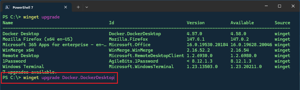 To update a desired app, you would enter winget upgrade Application_ID at the command prompt, where Application_ID is the Id setting for your intended app. In this example, the command to update the Docker Desktop app is winget upgrade Docker.DockerDesktop.