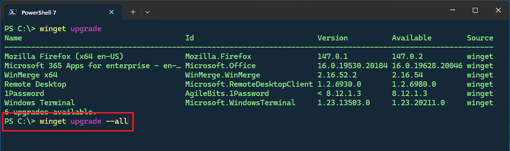The true power of WinGet is its ability to update all apps with a single command — simply type winget upgrade --all at the command prompt.